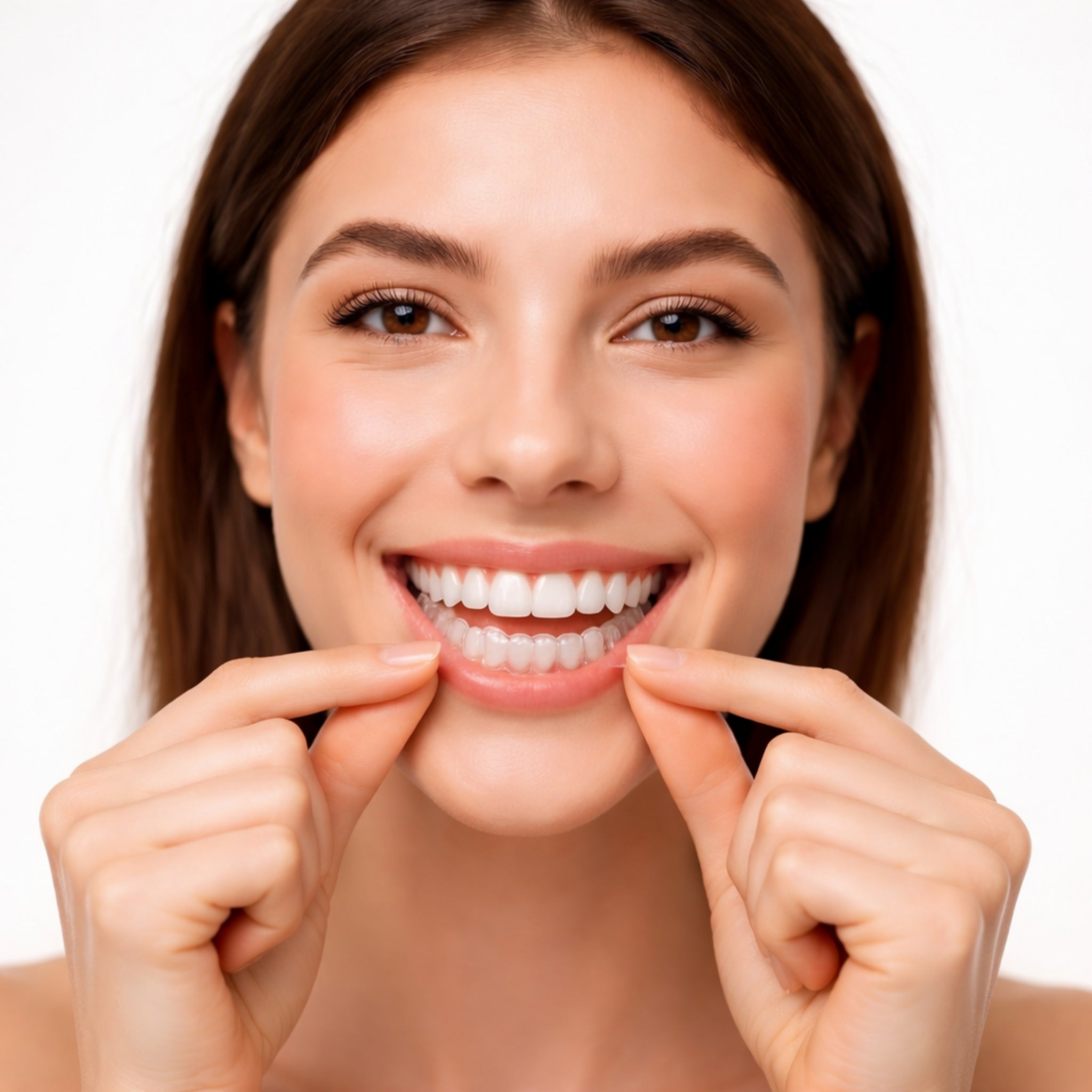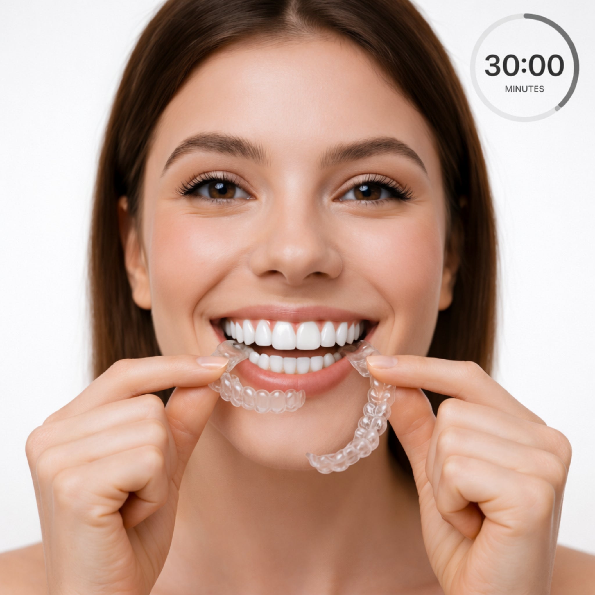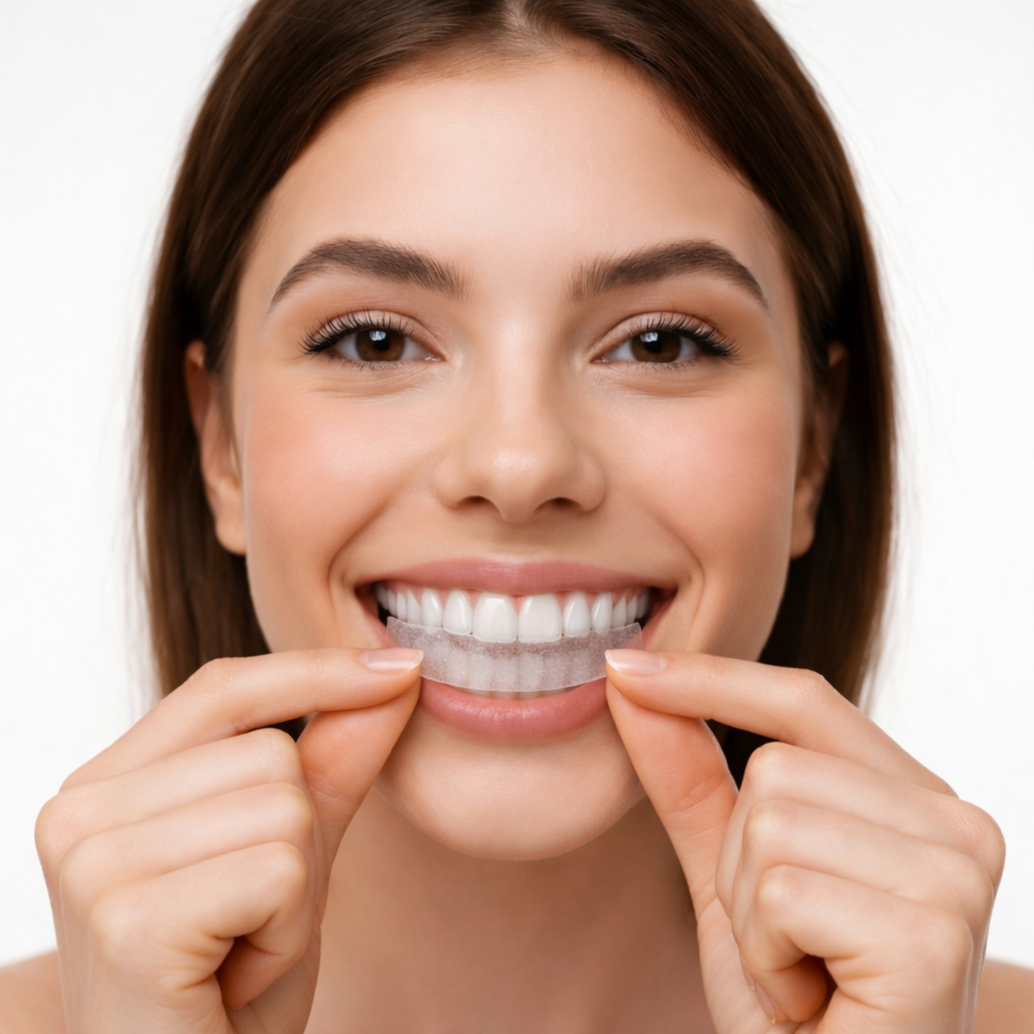 Aplicați banda cu partea adezivă pe dinți, apăsați-o bine cu degetele și îndoiți capătul în spatele dinților, pentru a rămâne fixată pe toată durata utilizării.